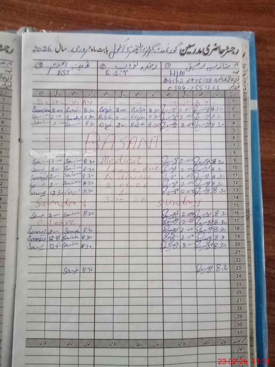 | Remarks (Use Separate Page if Required): Teacher Razia Nawab EST is marked absent today as medical leave wef 9 February 2026 for 30 days has not been approved so far | |||||