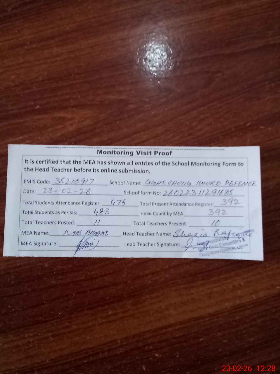 | Attendance Register | Head Teacher | MEA with School | Visit Proof |
