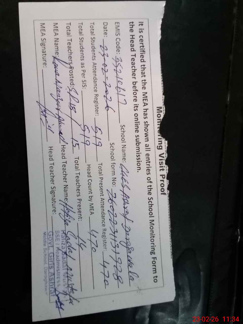 | Attendance Register | Head Teacher | MEA with School | Visit Proof |