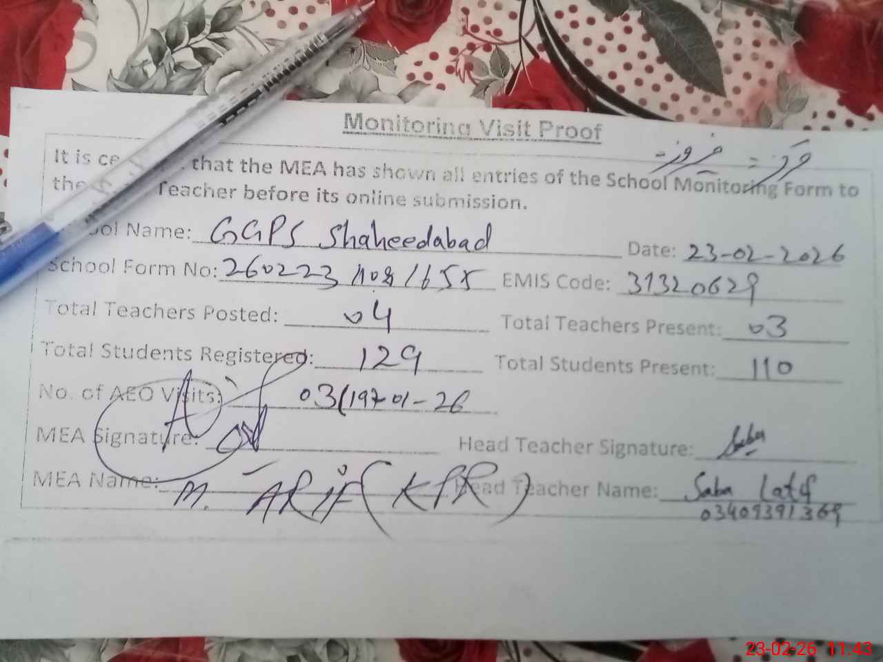 | Attendance Register | Head Teacher | MEA with School | Visit Proof |