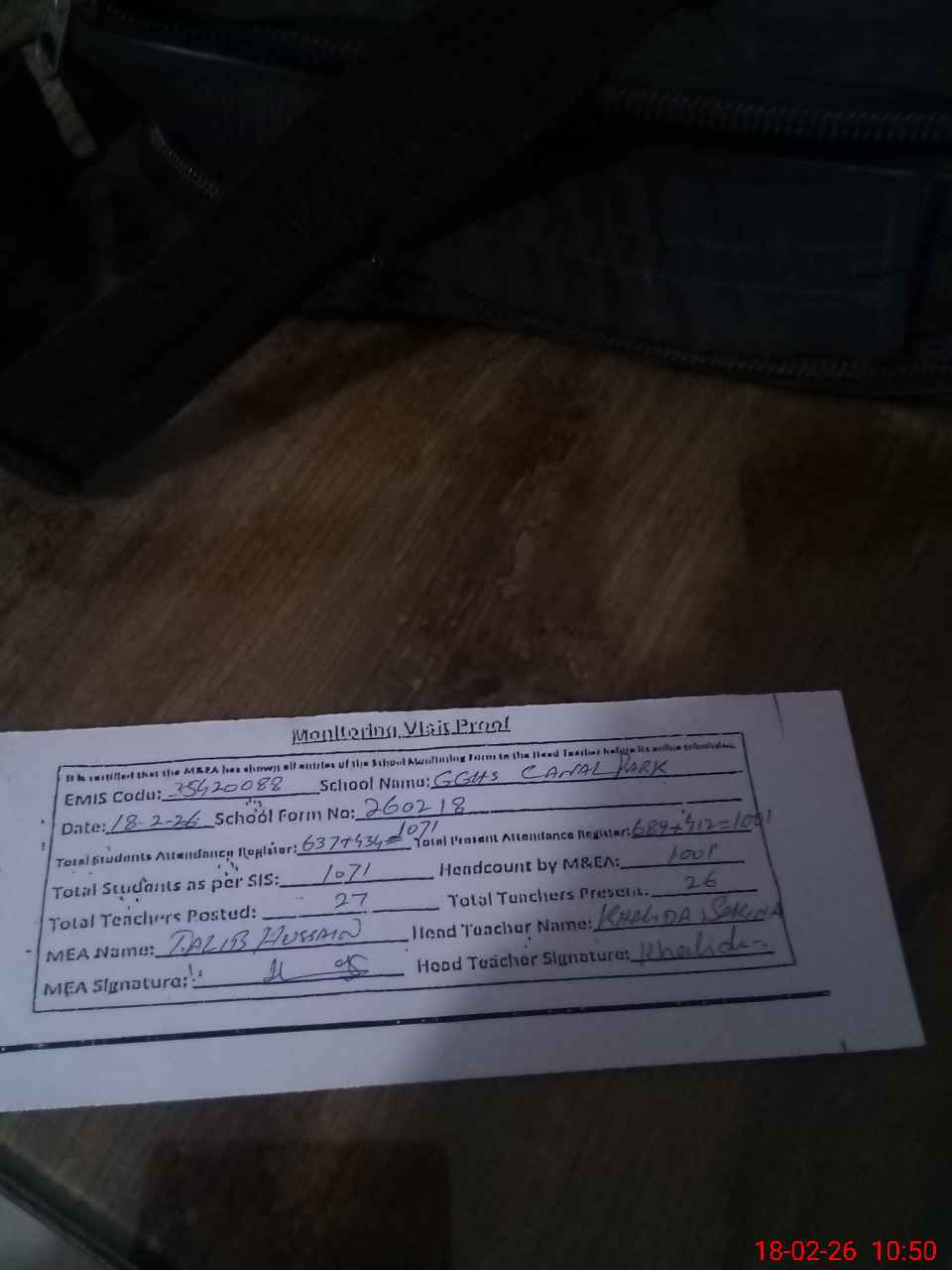 | Attendance Register | Head Teacher | MEA with School | Visit Proof |