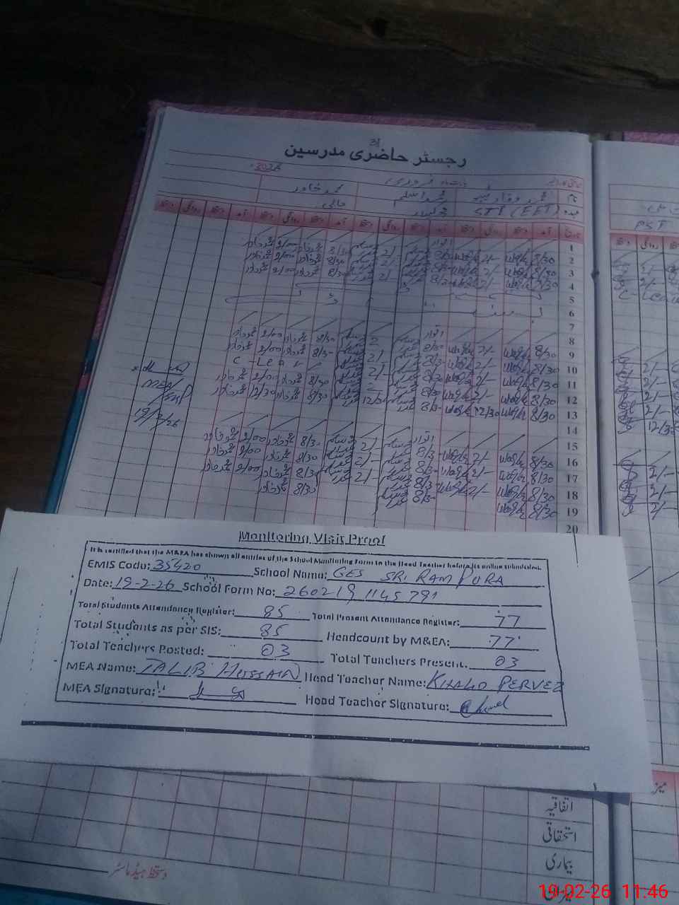 | Attendance Register | Head Teacher | MEA with School | Visit Proof |