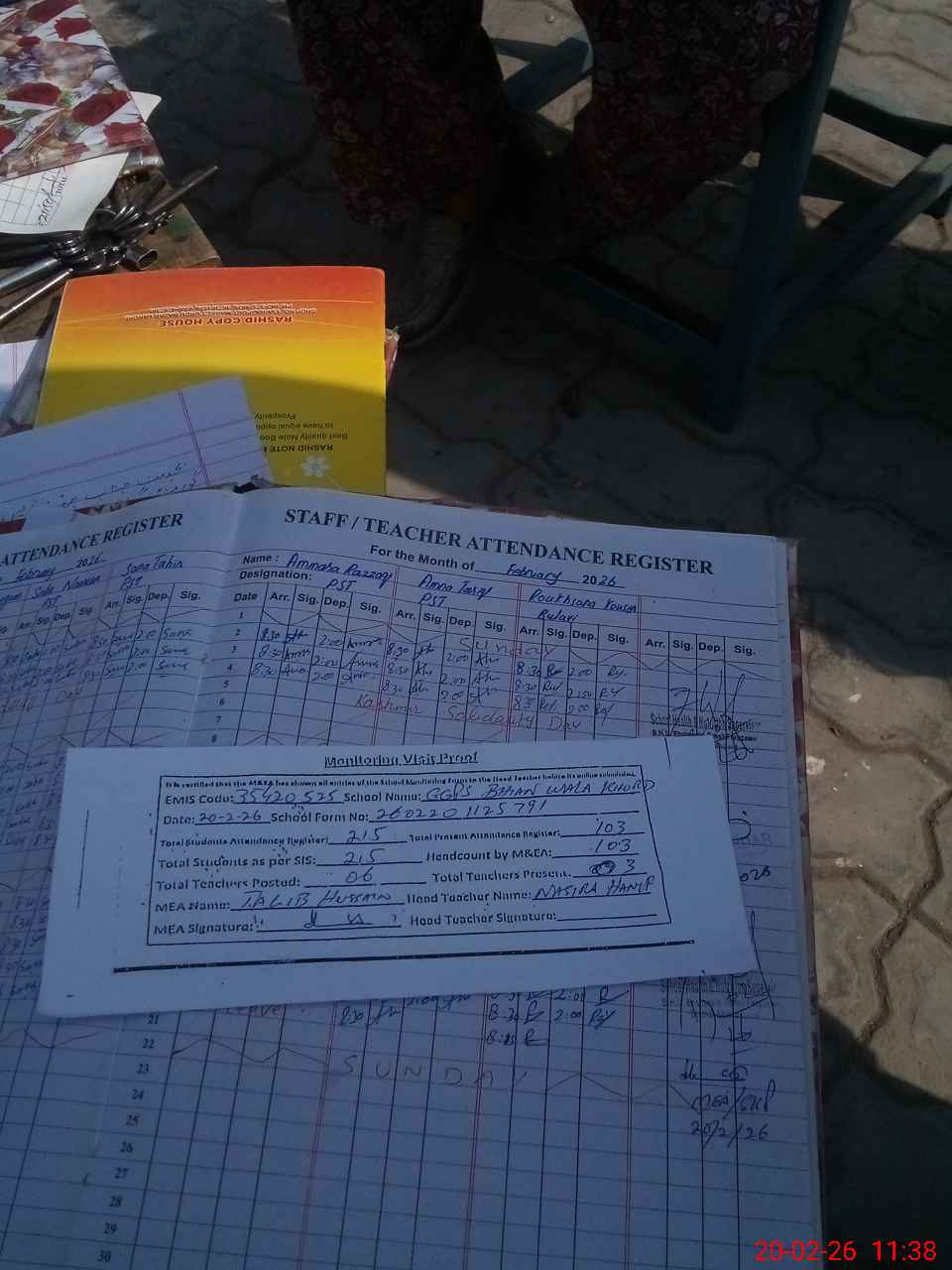 | Attendance Register | Head Teacher | MEA with School | Visit Proof |