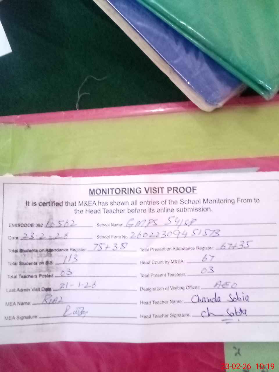 | Attendance Register | Head Teacher | MEA with School | Visit Proof |