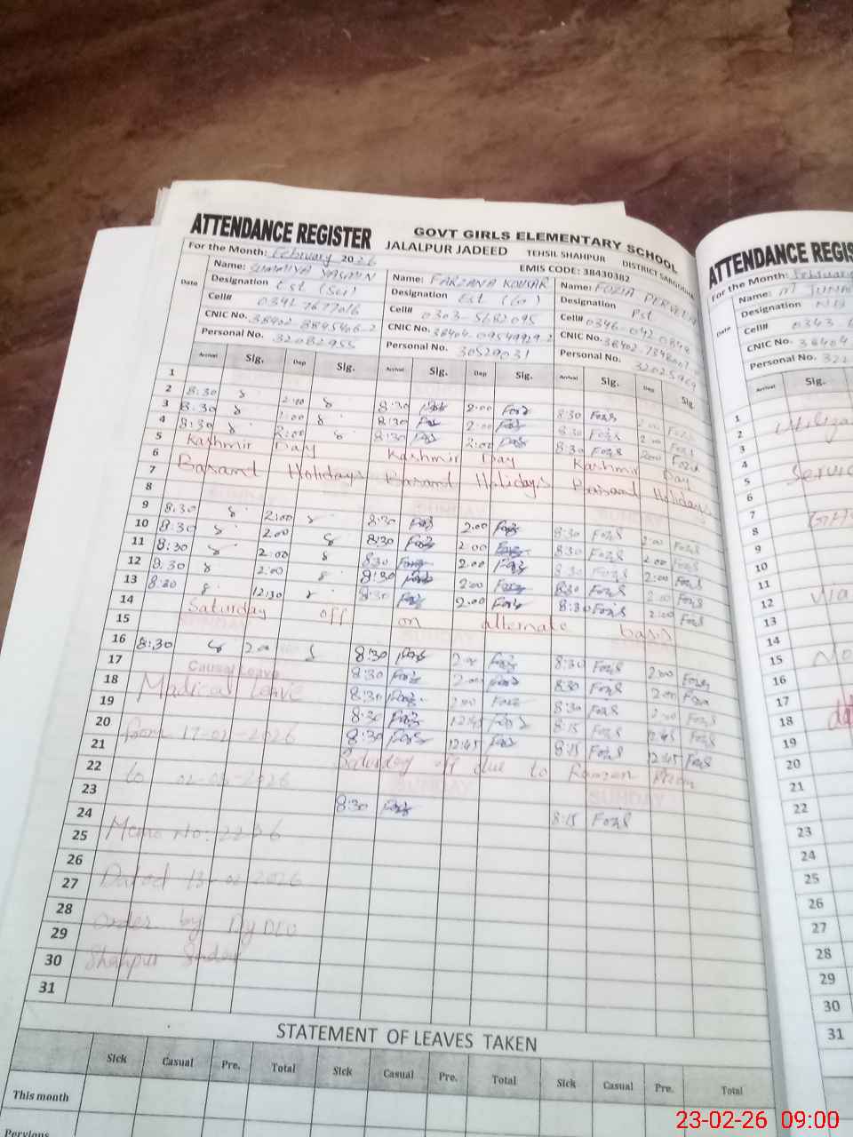 | CNIC | Full Name | Designation | R/C | Absence During Last Calender Month |