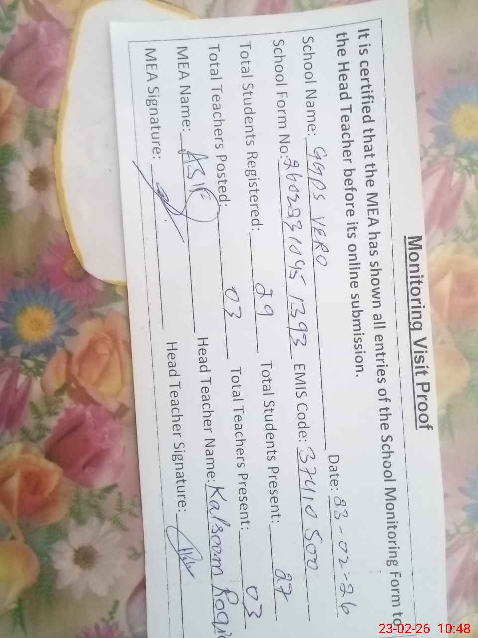 | Attendance Register | Head Teacher | MEA with School | Visit Proof |