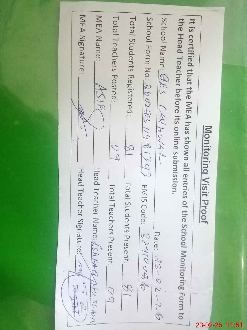 | Attendance Register | Head Teacher | MEA with School | Visit Proof |