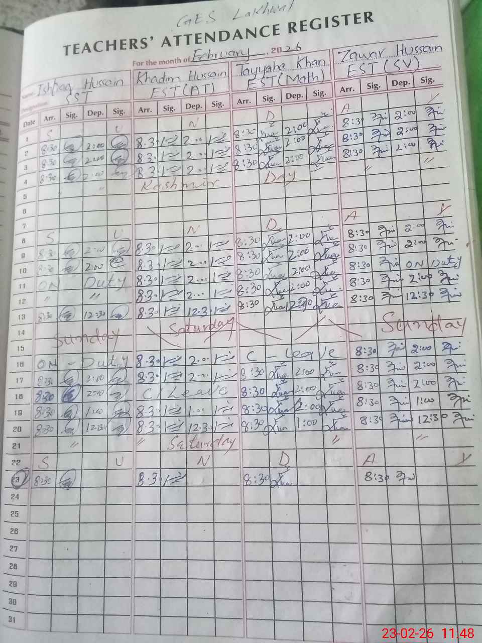 | CNIC | Full Name | Designation | R/C | Absence During Last Calender Month |