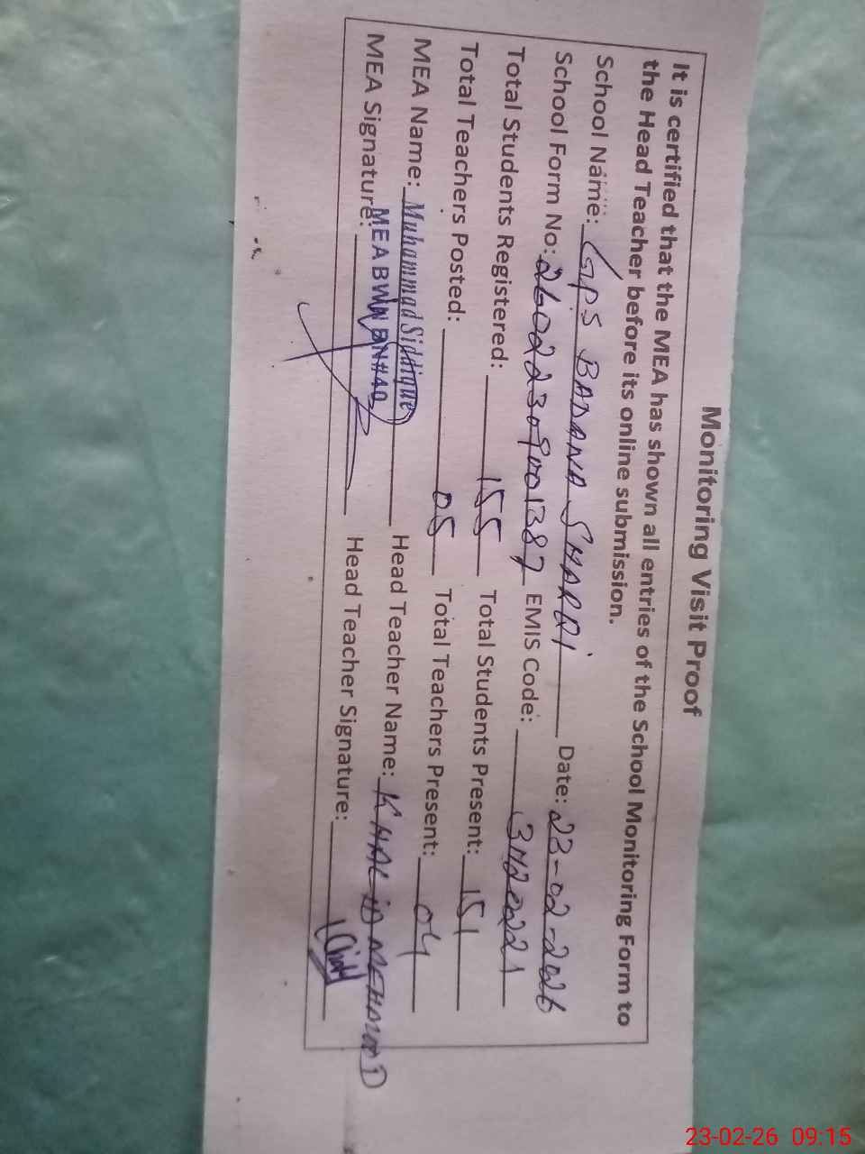 | EMIS Code: 31120221 | Name of School: GPS BADANA SHARQI | |||