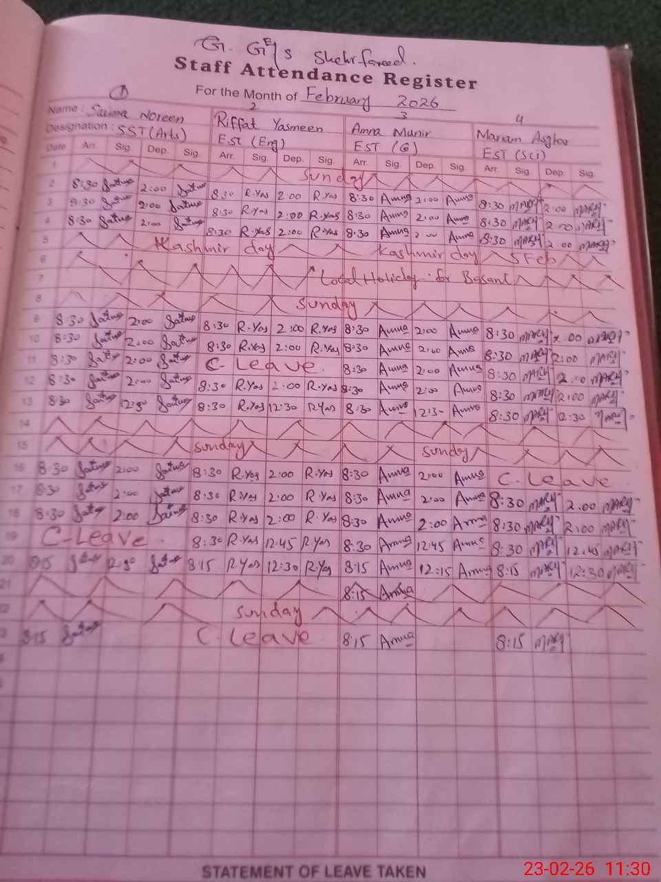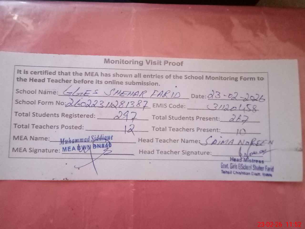 | Attendance Register | Head Teacher | MEA with School | Visit Proof |