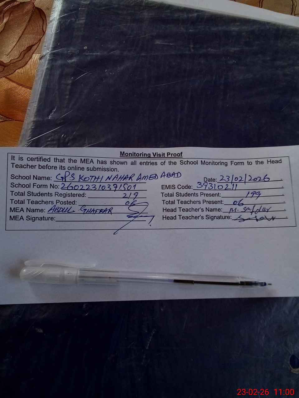 | Attendance Register | Head Teacher | MEA with School | Visit Proof |
