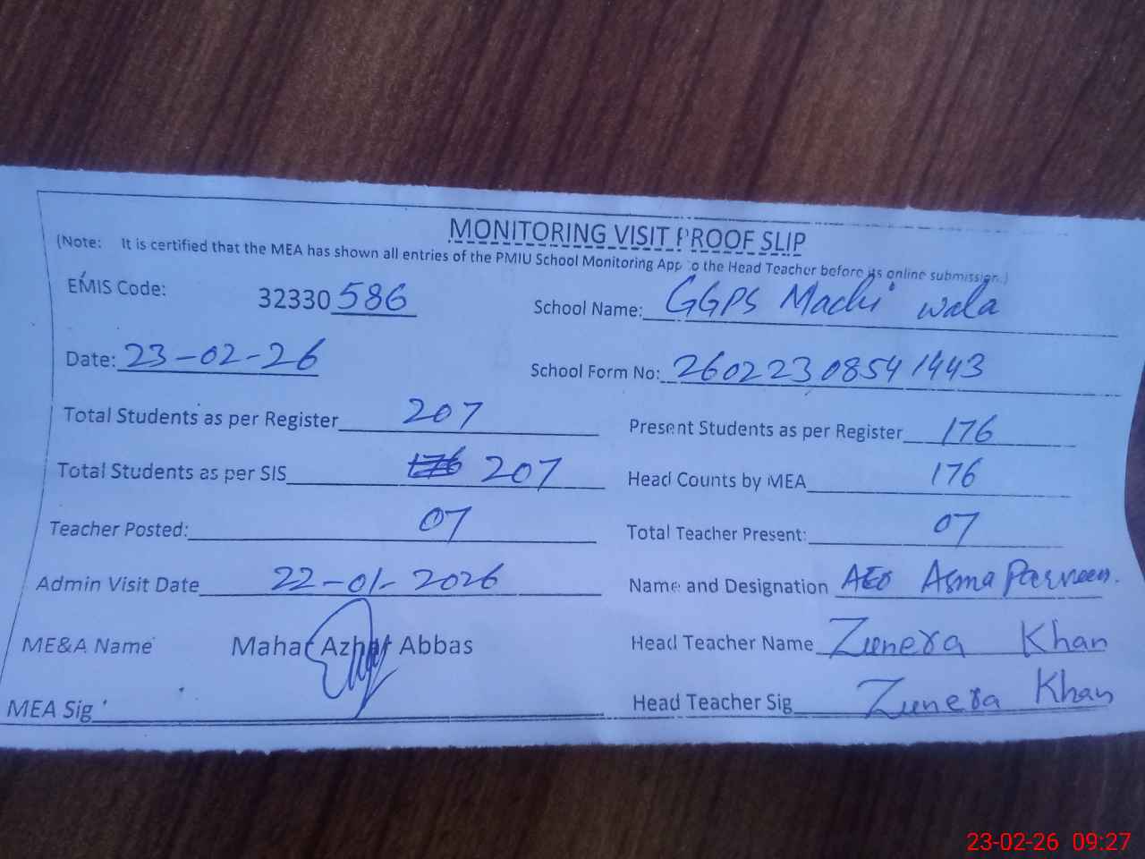 | Attendance Register | Head Teacher | MEA with School | Visit Proof |