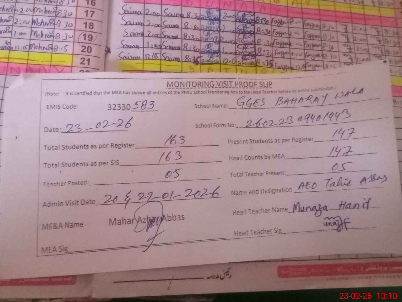 | Attendance Register | Head Teacher | MEA with School | Visit Proof |