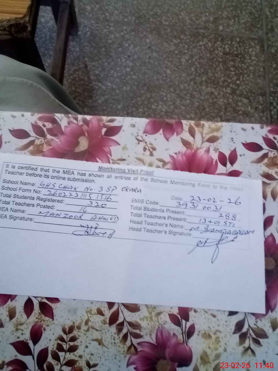 | EMIS Code: 39310031 | Name of School: GHS CHAK NO. 3/SP OKARA | |||