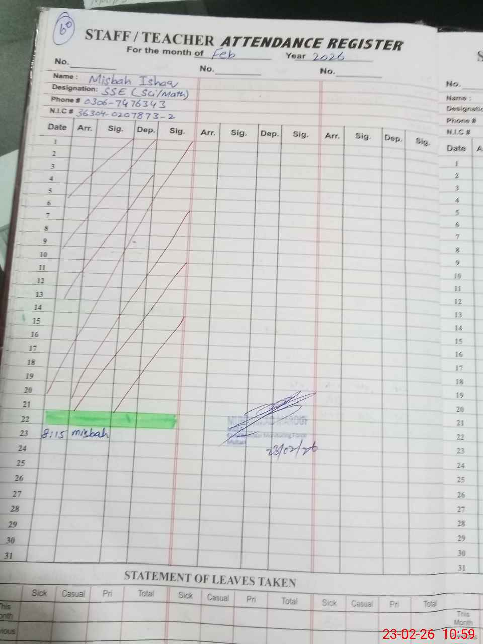 | CNIC | Full Name | Designation | R/C | Absence during last cal. month |