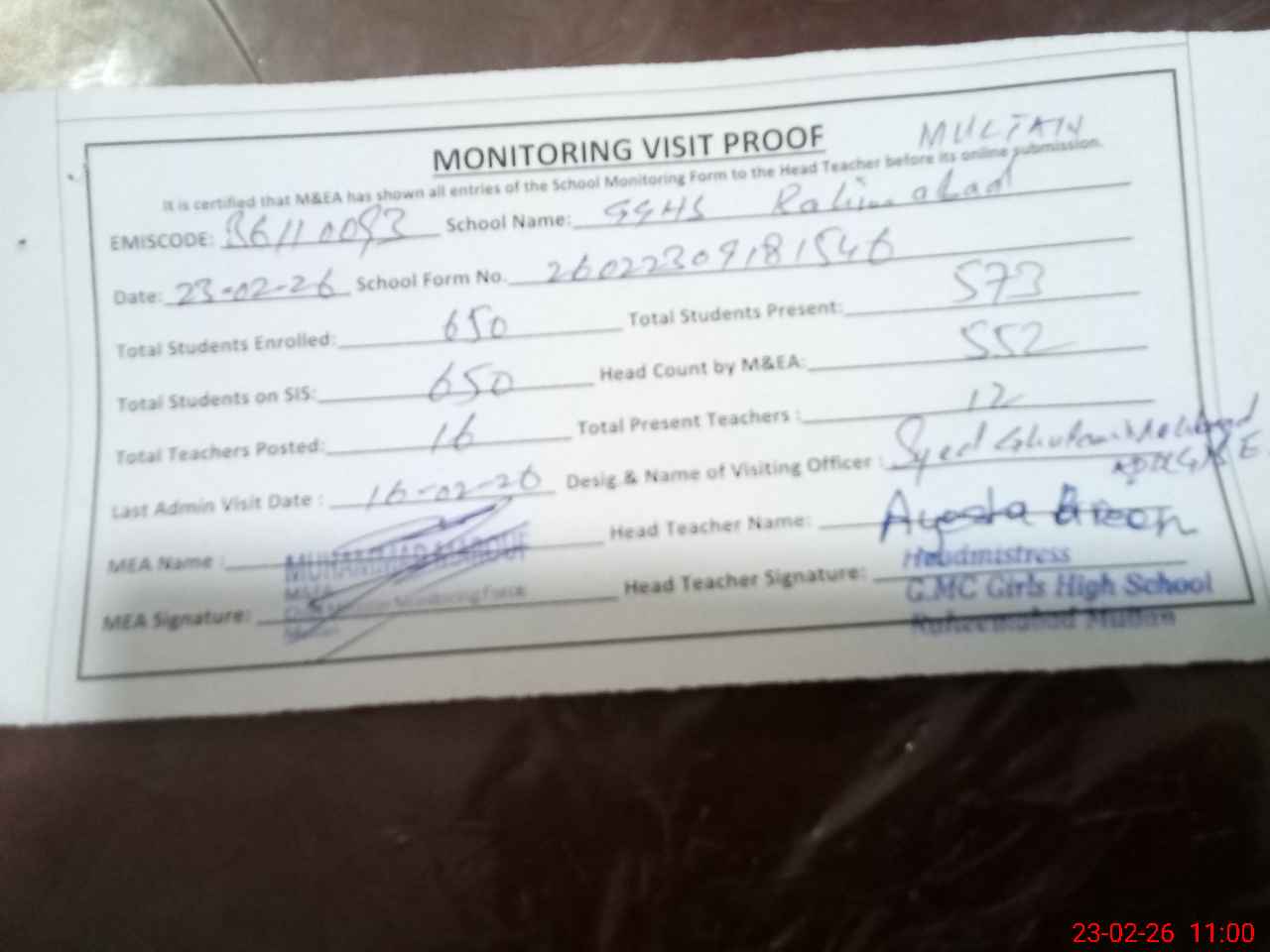 | Attendance Register | Head Teacher | MEA with School | Visit Proof |