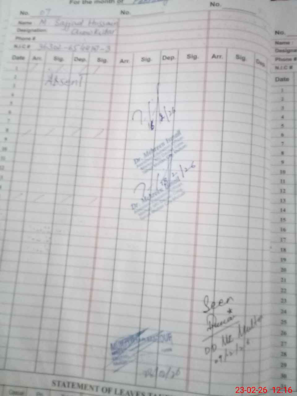| CNIC | Full Name | Designation | R/C | Absence During Last Calender Month |