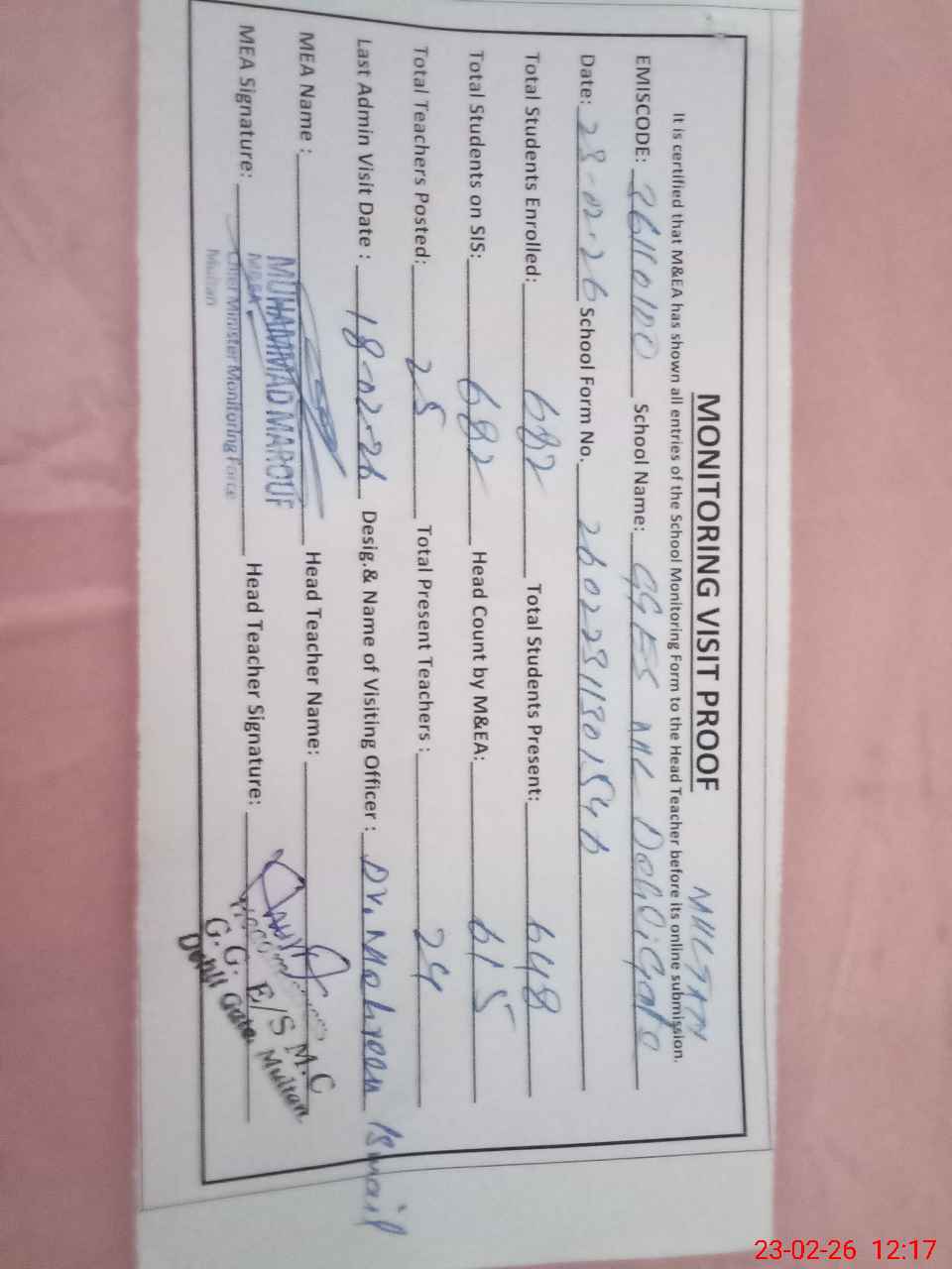 | Certified that this School was Inspected by the Undersigned MEA/DMO Today and the Information Stated Above is as Per Record. | |||||