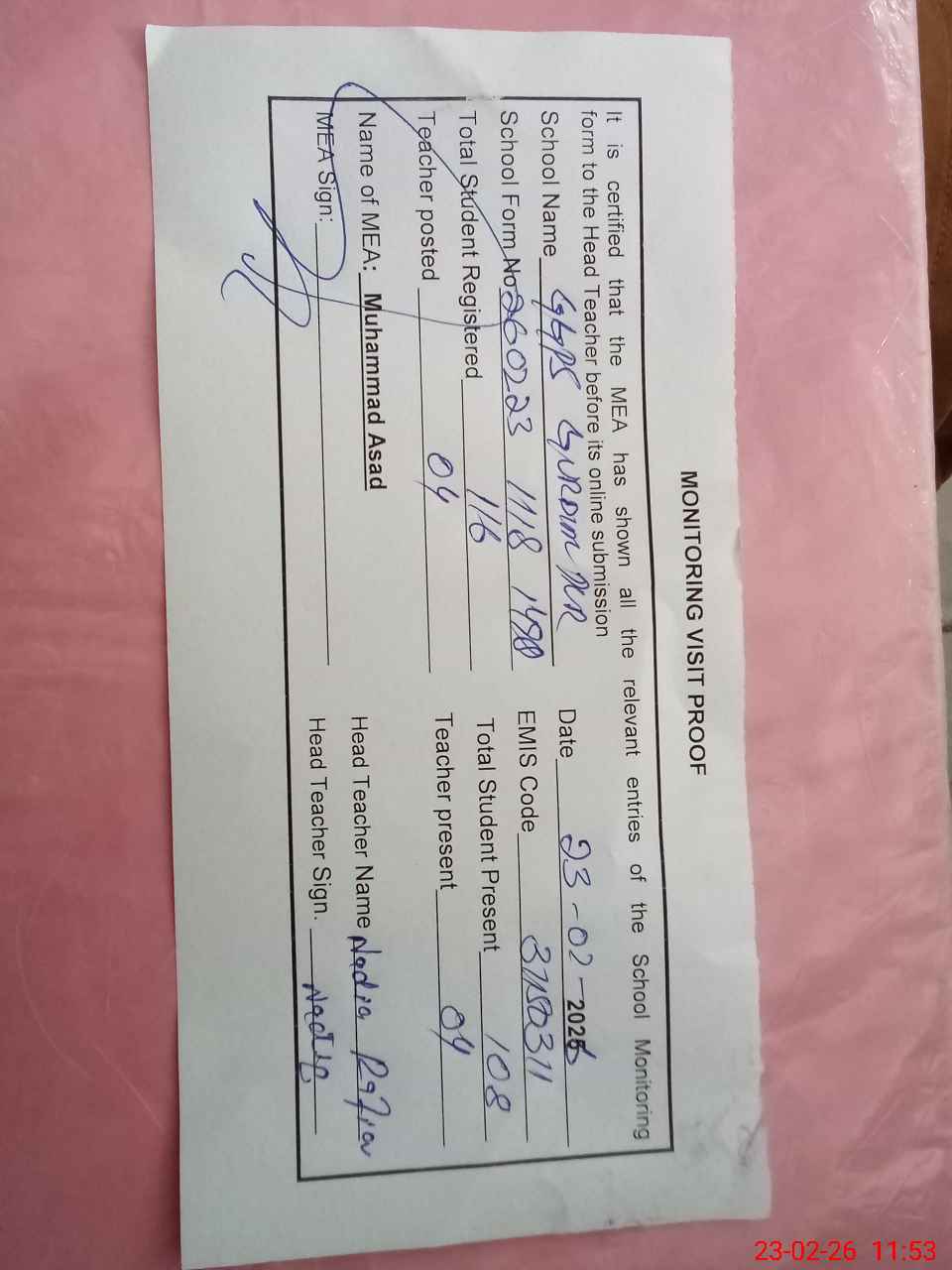 | Attendance Register | Head Teacher | MEA with School | Visit Proof |