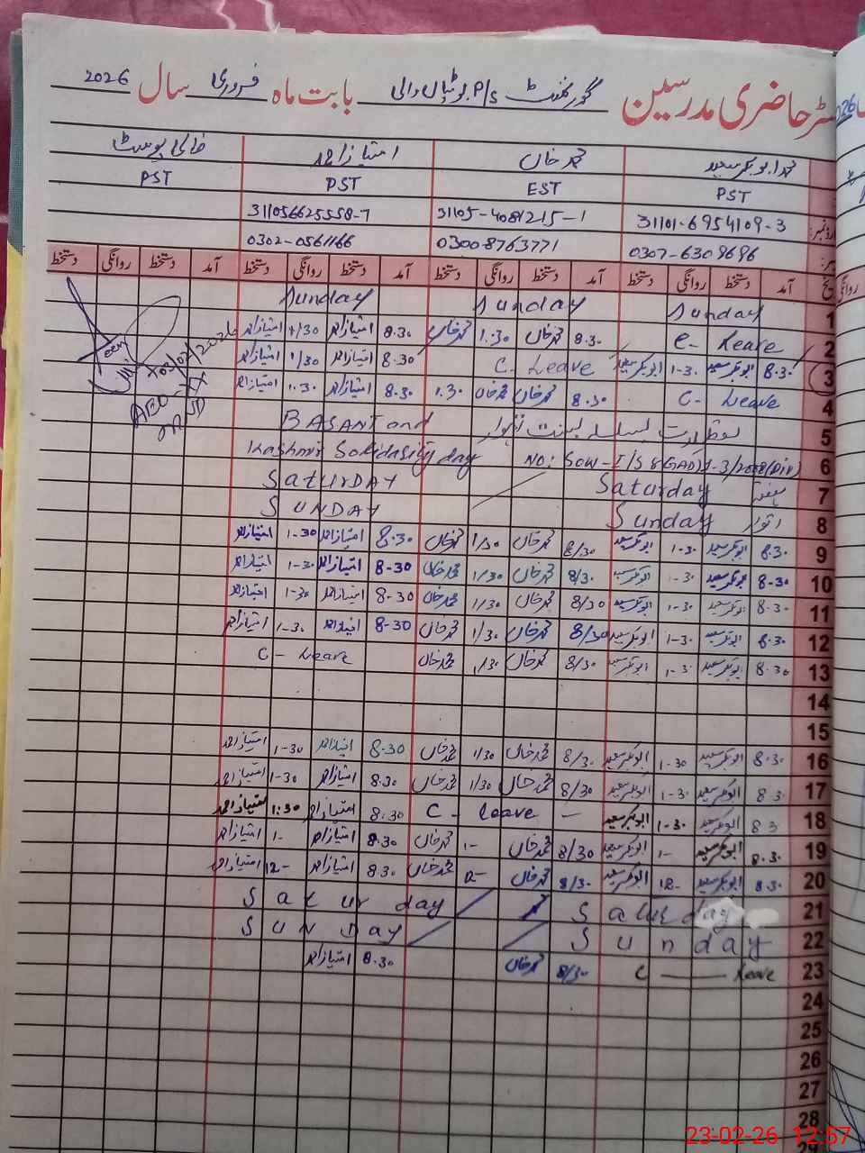 | CNIC | Full Name | Designation | R/C | Absence During Last Calender Month |