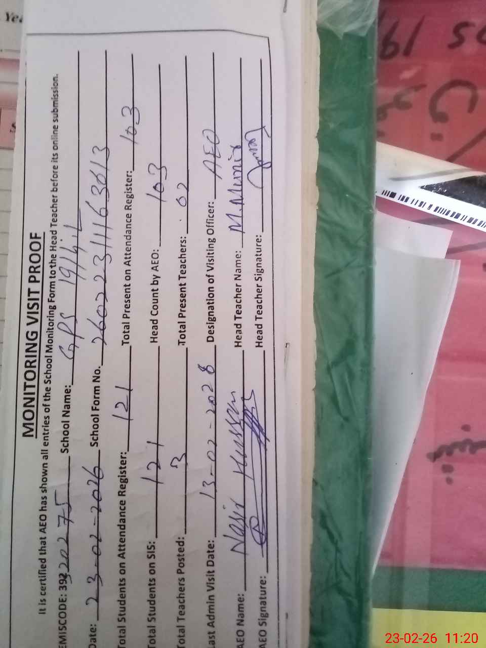 | Attendance Register | Head Teacher | MEA with School | Visit Proof |