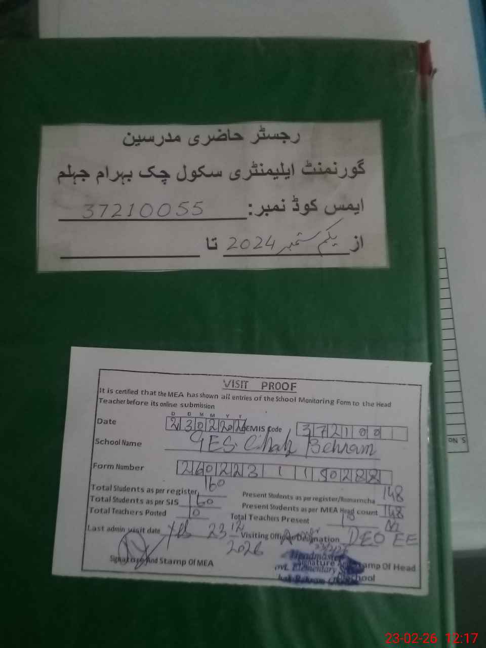 | Attendance Register | Head Teacher | MEA with School | Visit Proof |