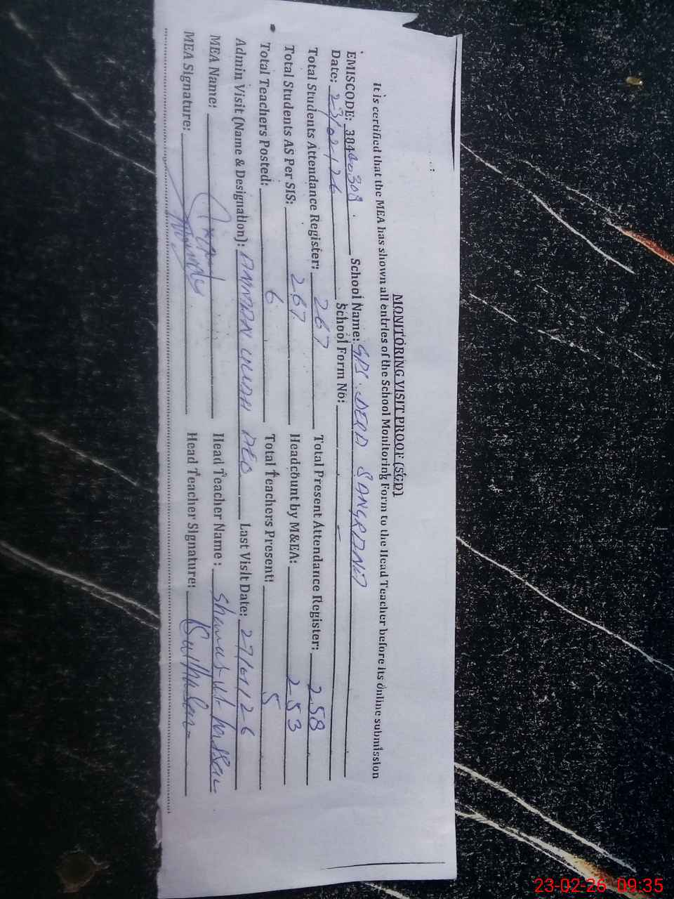 | Attendance Register | Head Teacher | MEA with School | Visit Proof |