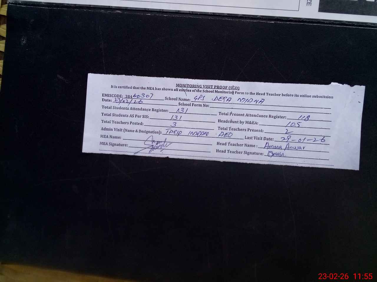 | Attendance Register | Head Teacher | MEA with School | Visit Proof |