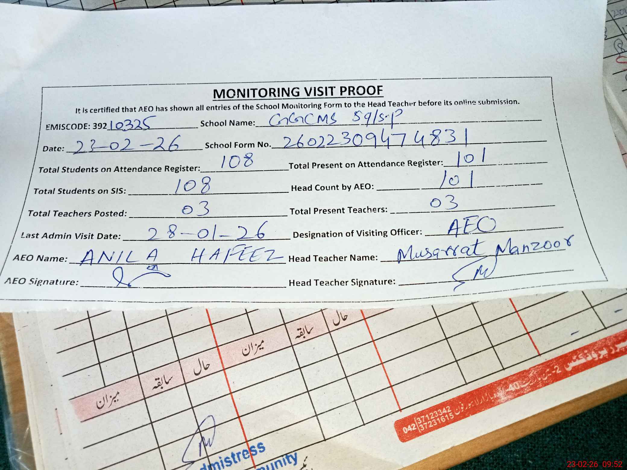 | Attendance Register | Head Teacher | MEA with School | Visit Proof |