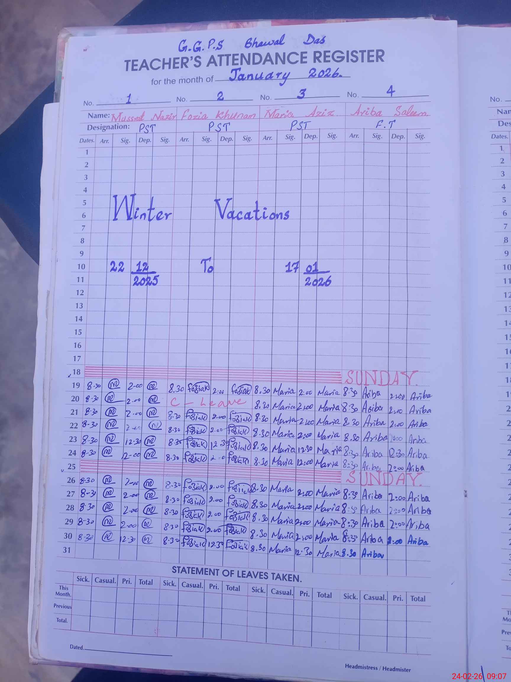 | Leave | Duty | Absent | Maternity | Medical | Ex- Pak |