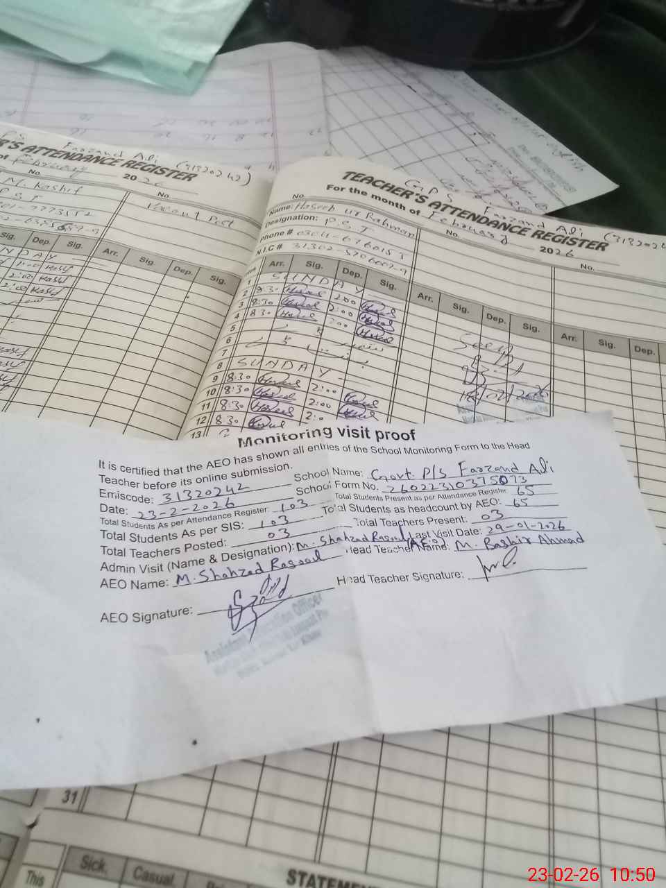 | Attendance Register | Head Teacher | MEA with School | Visit Proof |