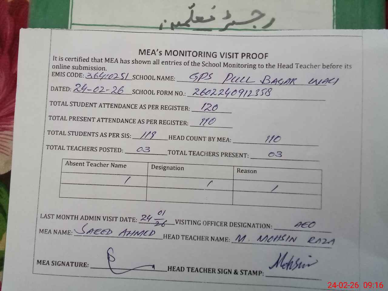 | Attendance Register | Head Teacher | MEA with School | Visit Proof |