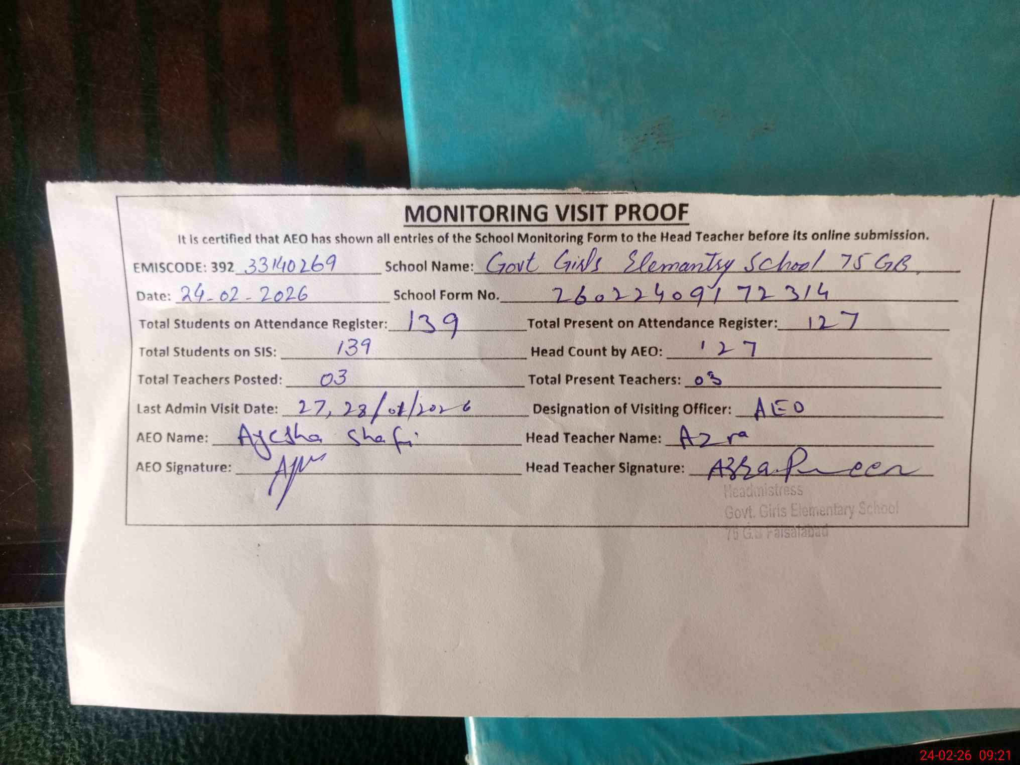 | Attendance Register | Head Teacher | MEA with School | Visit Proof |