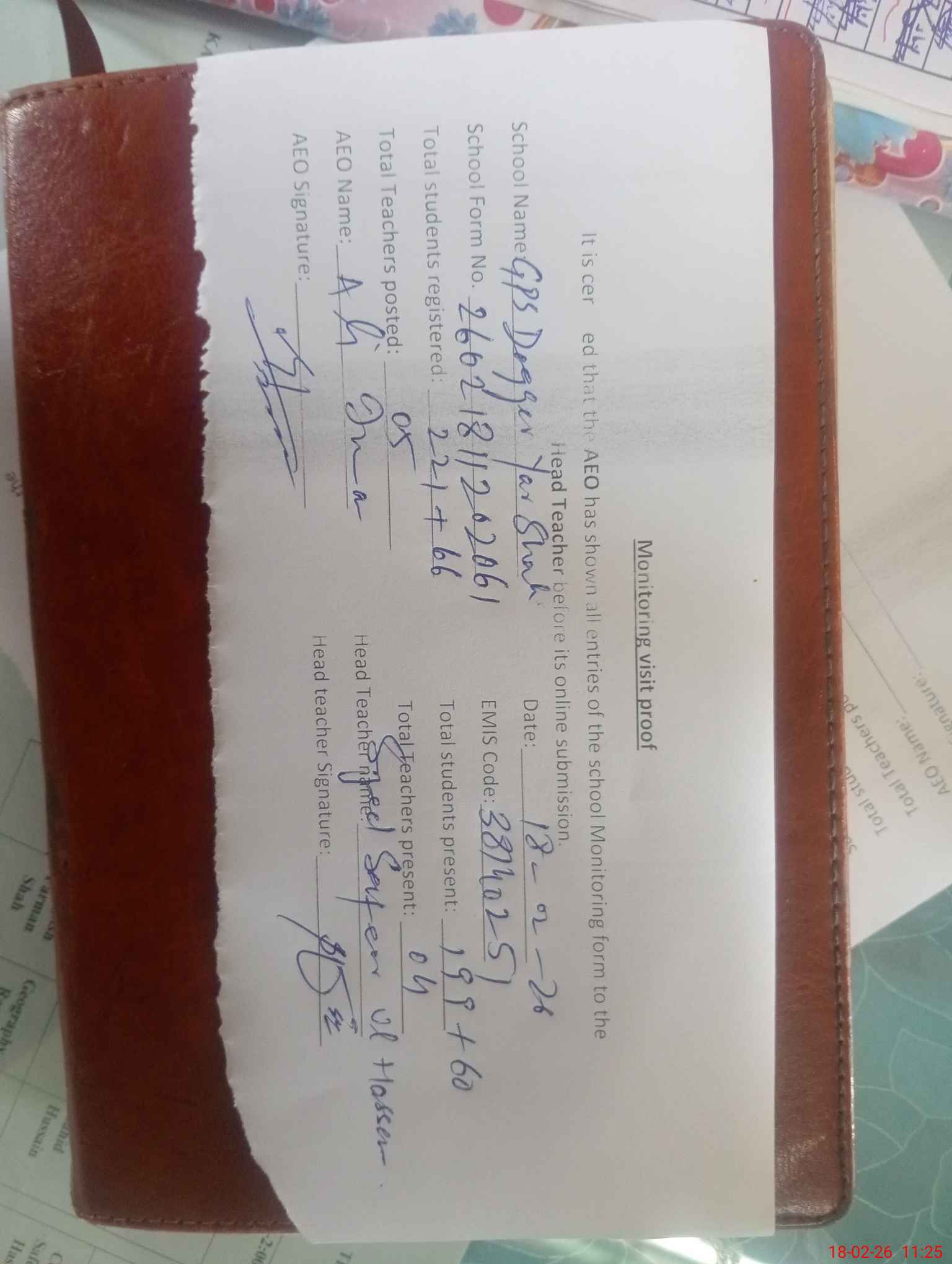 | Attendance Register | Head Teacher | MEA with School | Visit Proof |