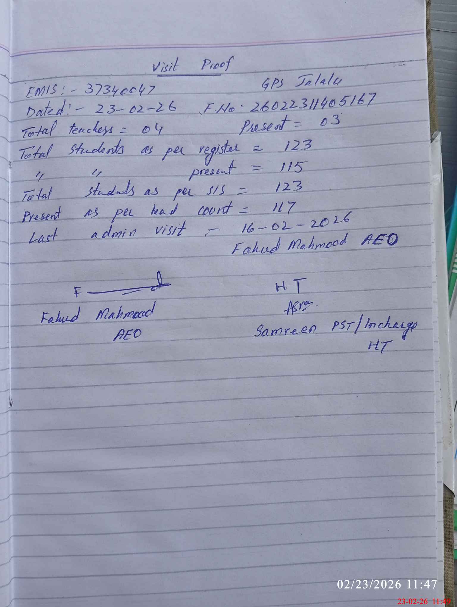 | Attendance Register | Head Teacher | MEA with School | Visit Proof |