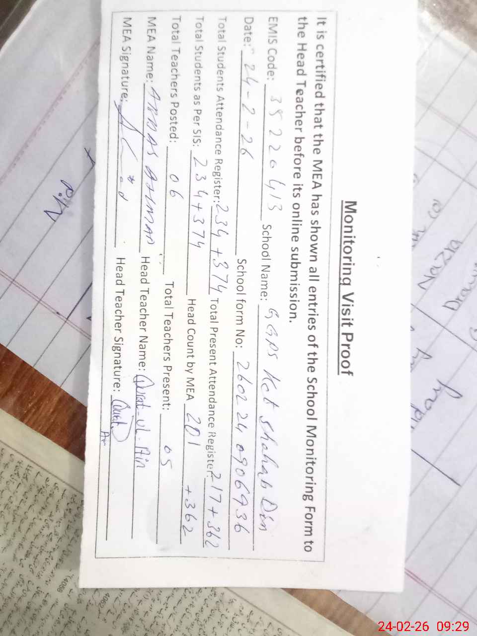 | Attendance Register | Head Teacher | MEA with School | Visit Proof |