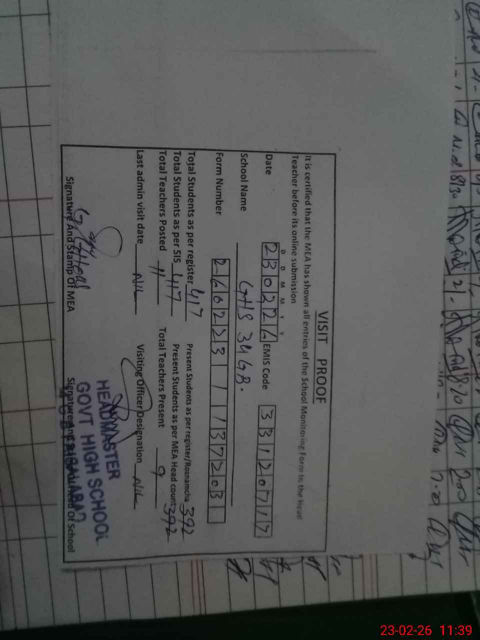 | Attendance Register | Head Teacher | MEA with School | Visit Proof |
