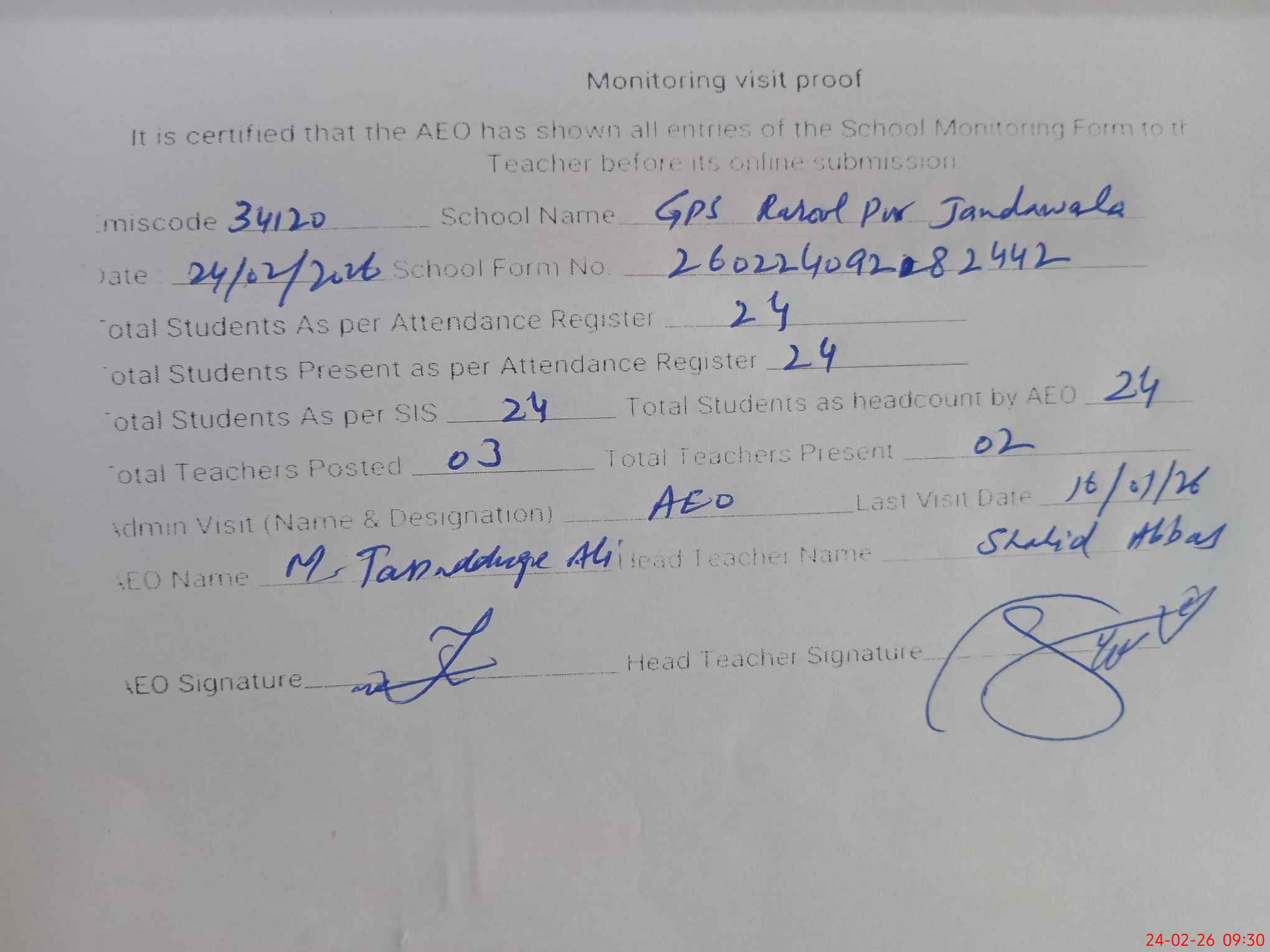 | Attendance Register | Head Teacher | MEA with School | Visit Proof |