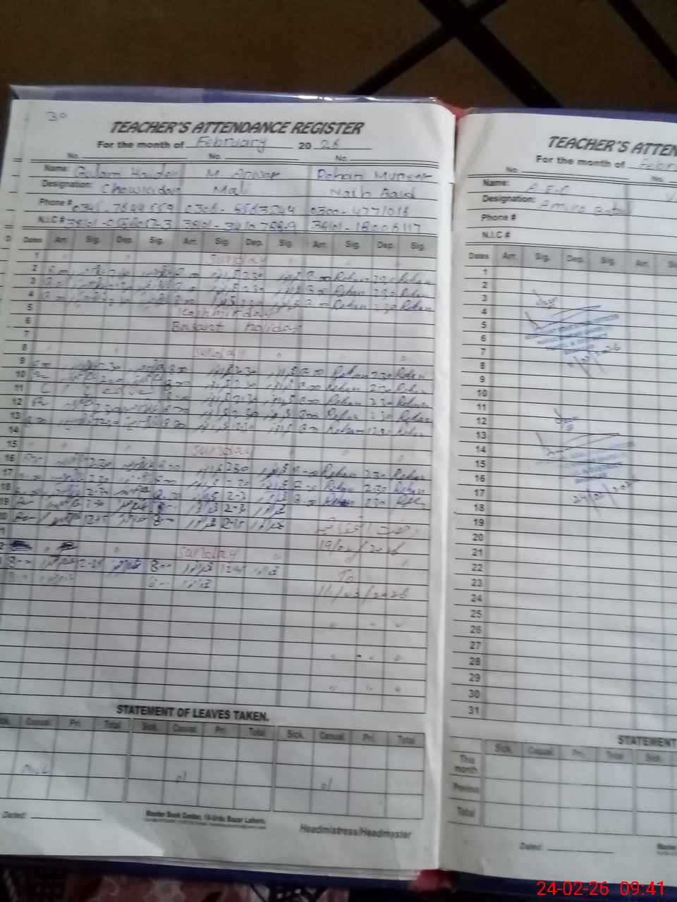 | CNIC | Full Name | Designation | R/C | Absence During Last Calender Month |
