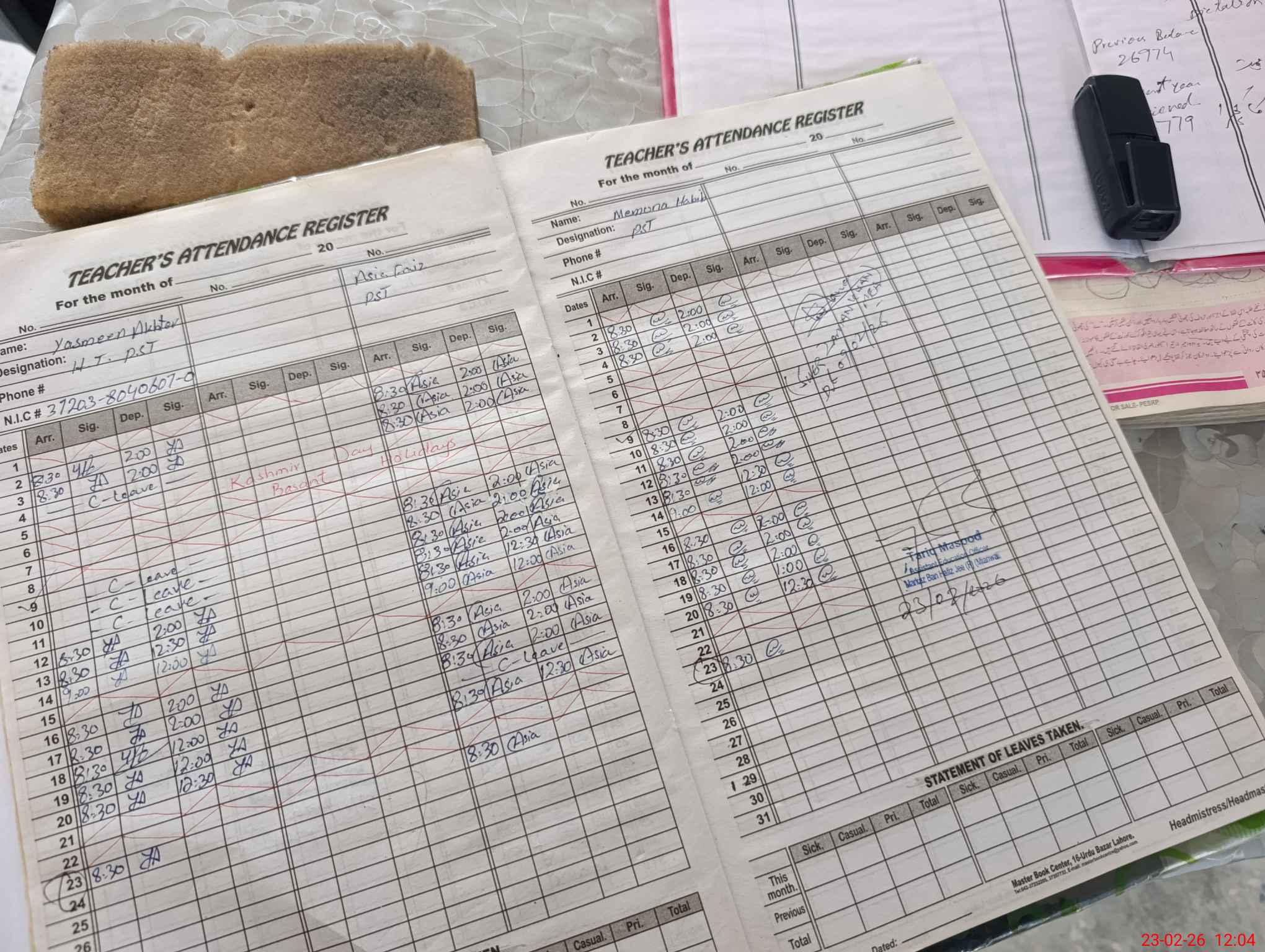 | CNIC | Full Name | Designation | R/C | Absence During Last Calender Month |