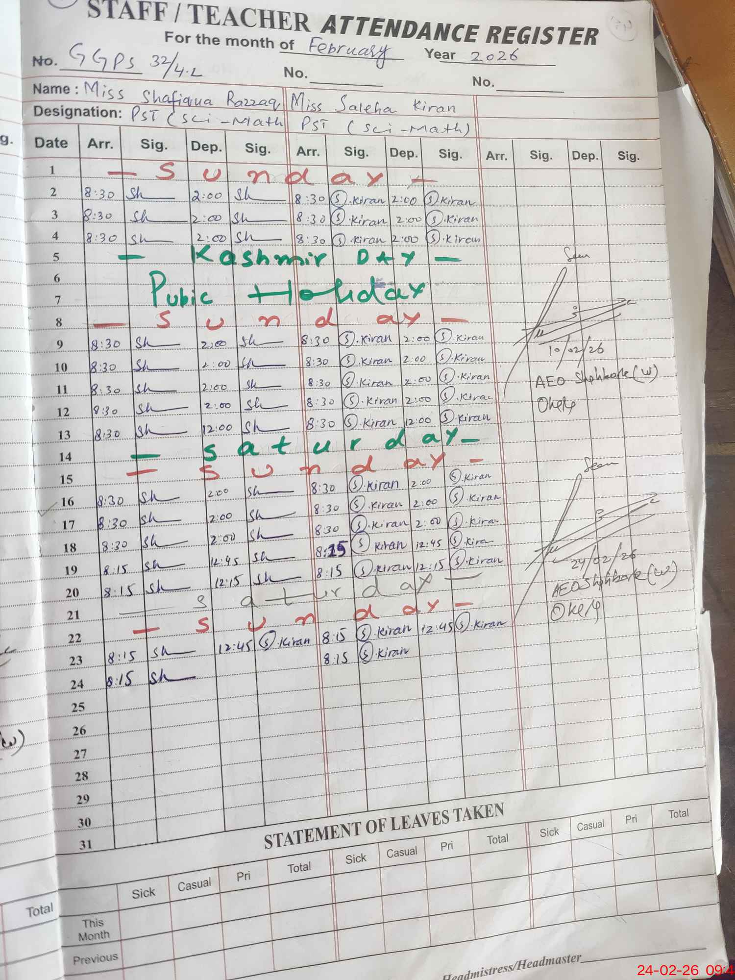 | Leave | Duty | Absent | Maternity | Medical | Ex- Pak |