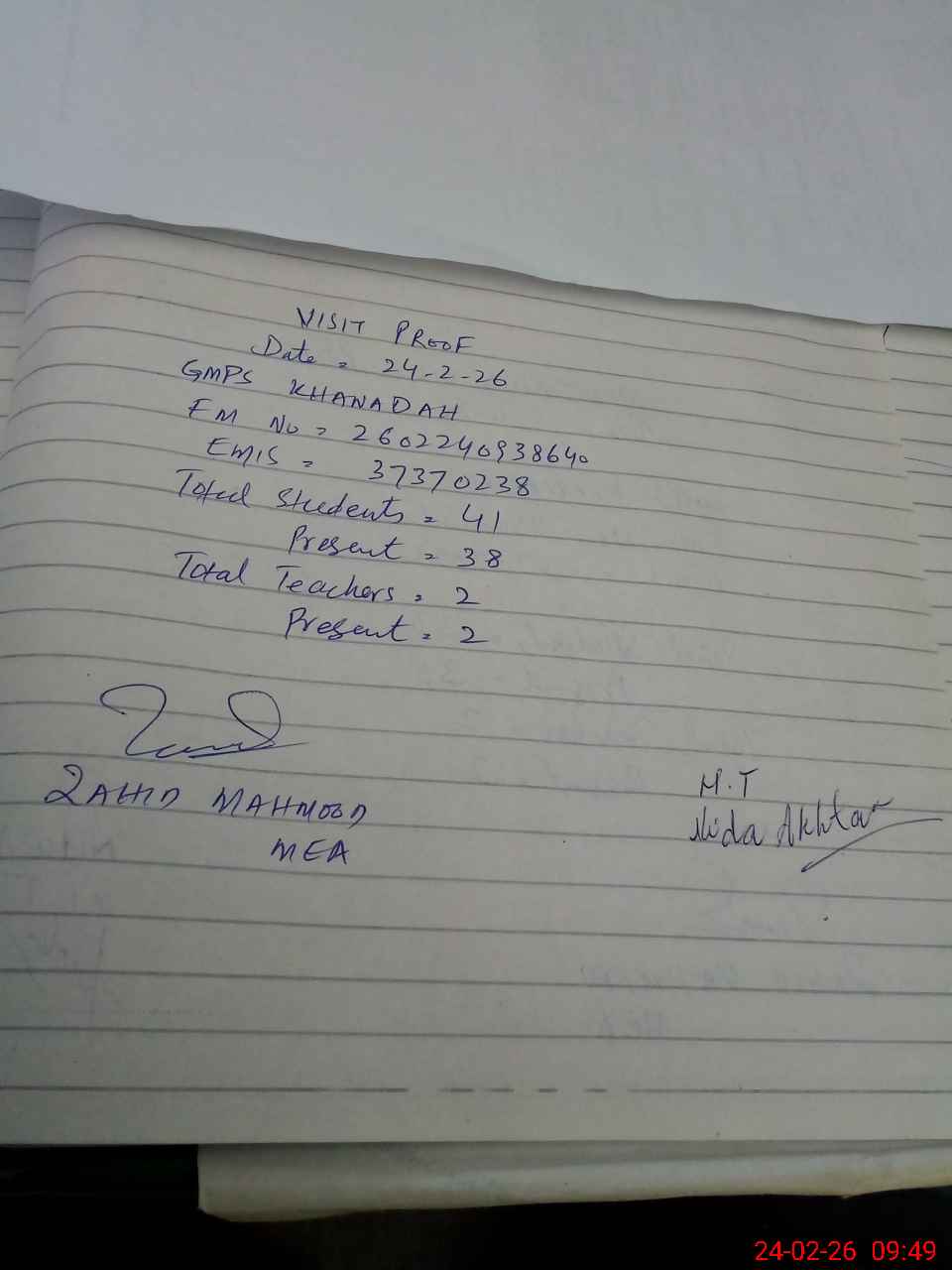 | Certified that this School was Inspected by the Undersigned MEA/DMO Today and the Information Stated Above is as Per Record. | |||||