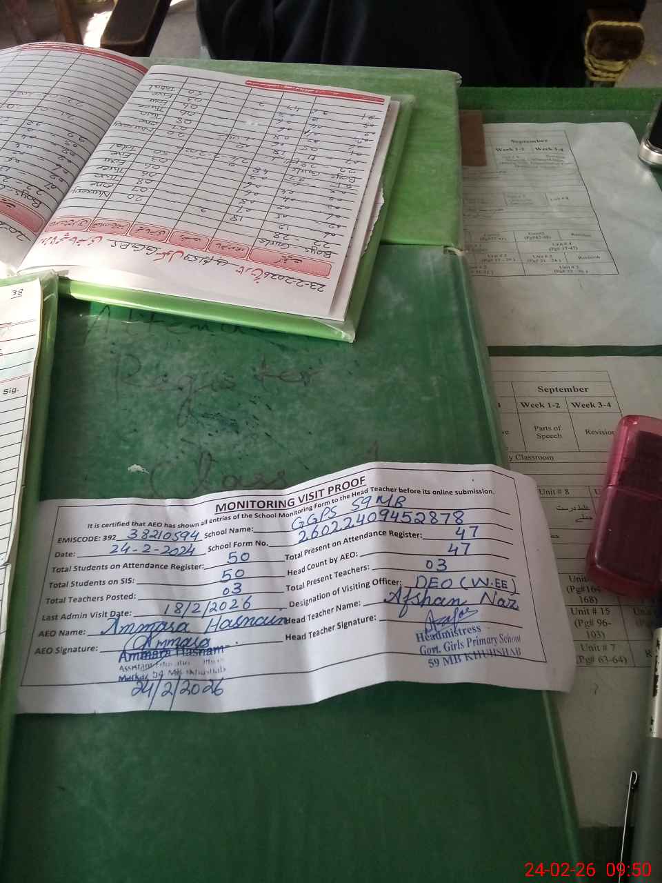 | Attendance Register | Head Teacher | MEA with School | Visit Proof |