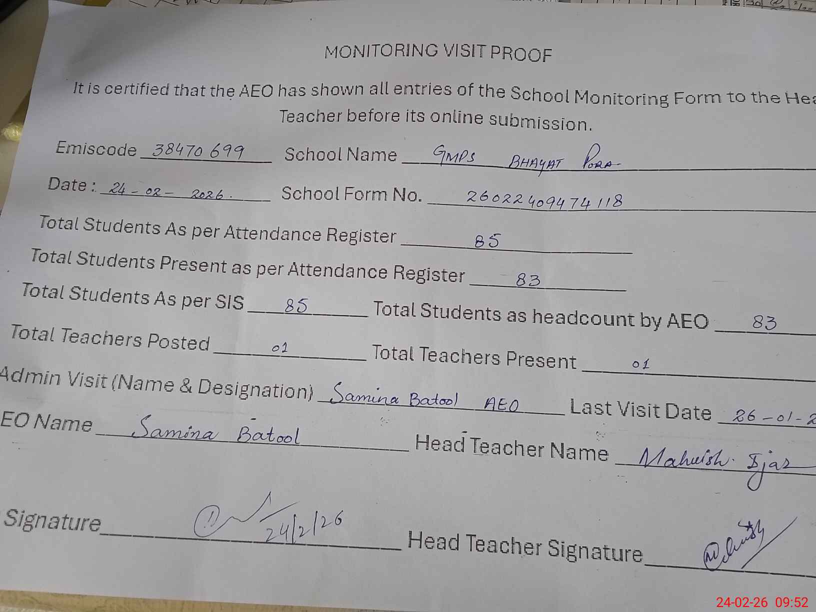 | Attendance Register | Head Teacher | MEA with School | Visit Proof |