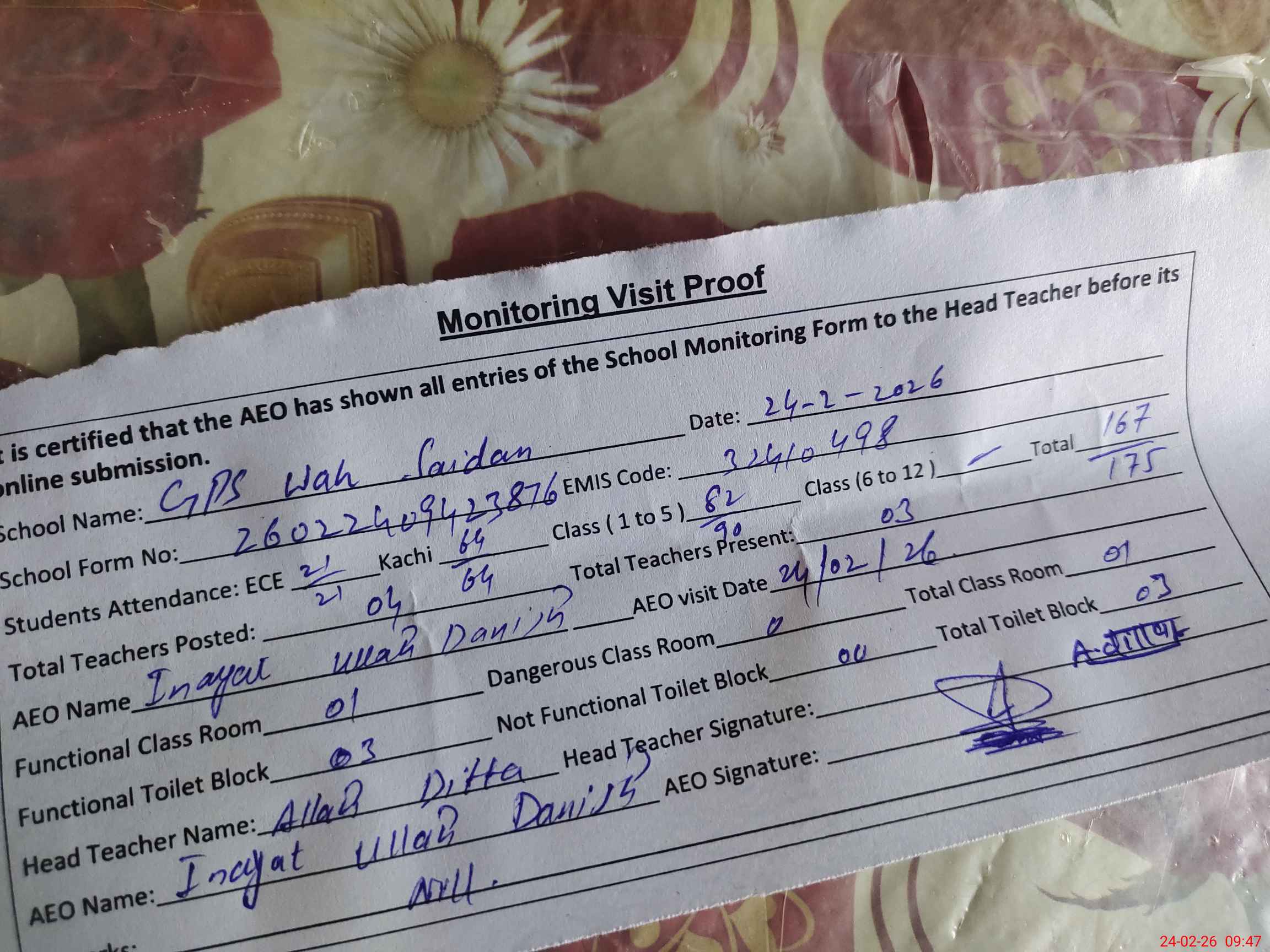 | EMIS Code: 32410498 | Name of School: GPS WAH SAIDAN PO DAJAL RANJAN PUR | |||