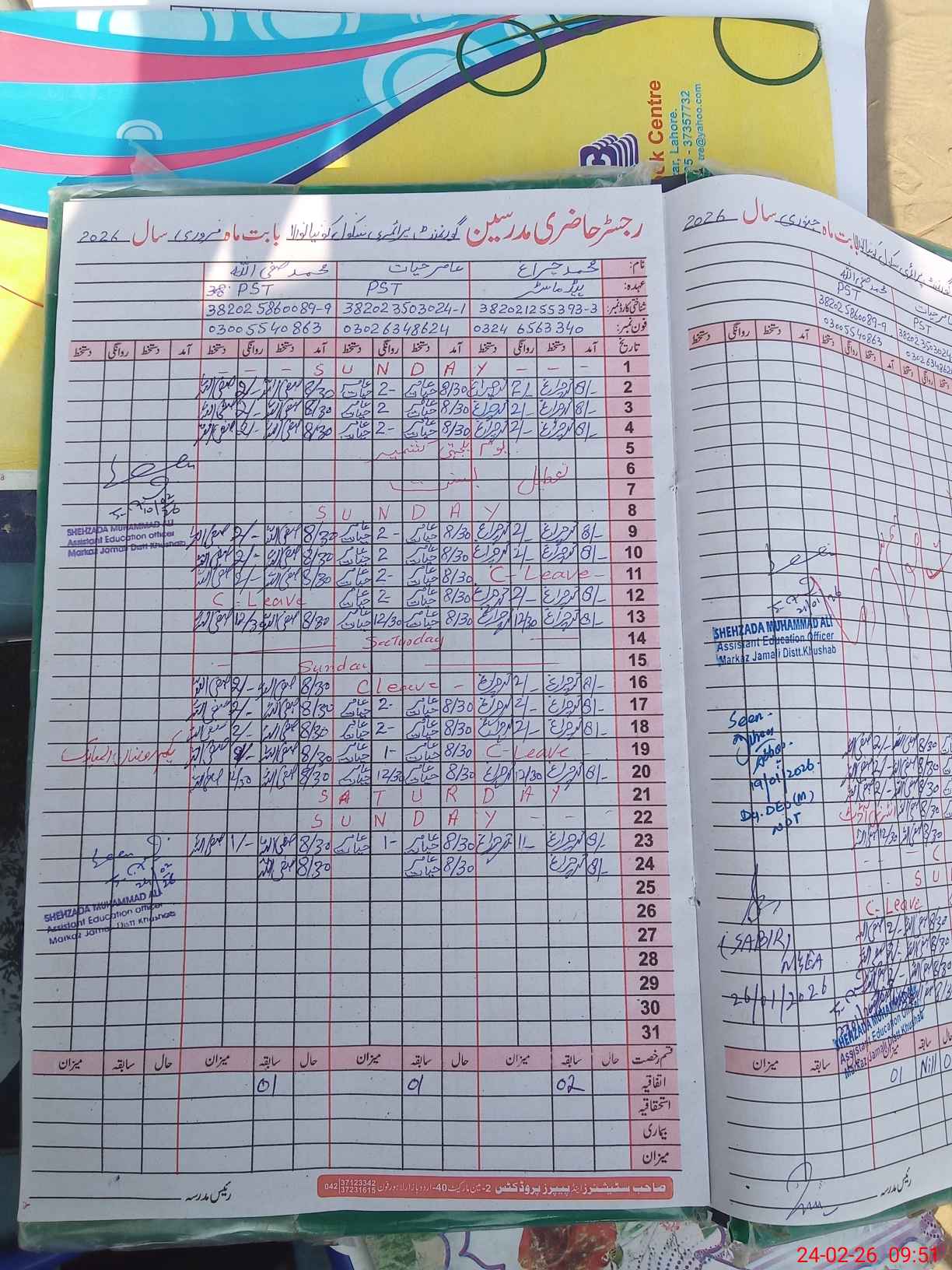 | CNIC | Full Name | Designation | R/C | Absence during last cal. month |