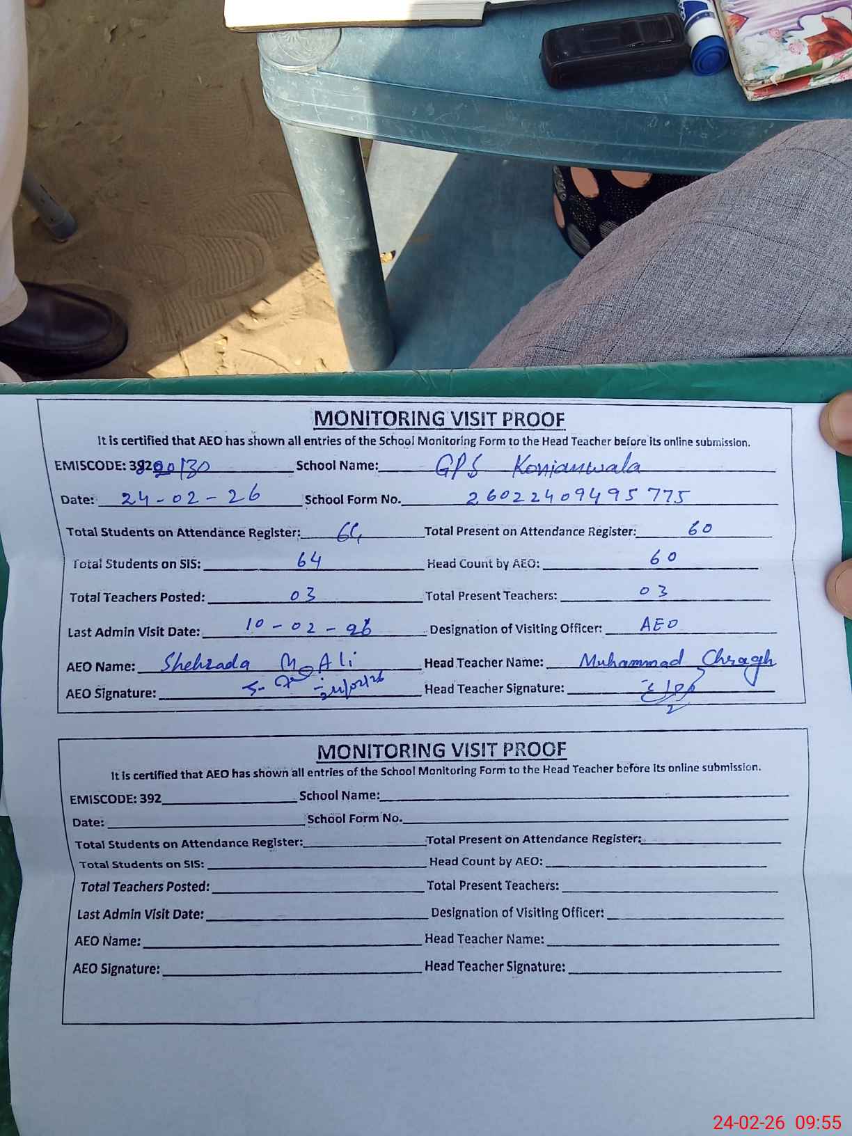 | Attendance Register | Head Teacher | MEA with School | Visit Proof |