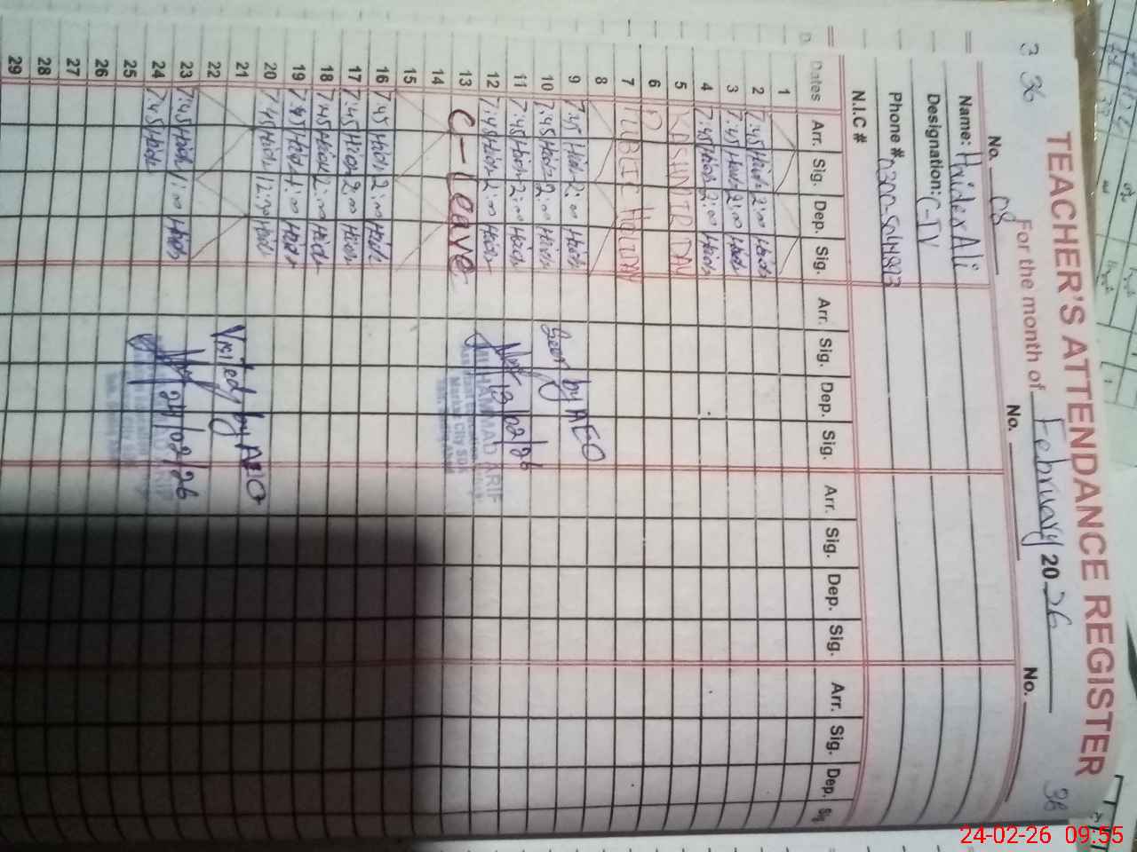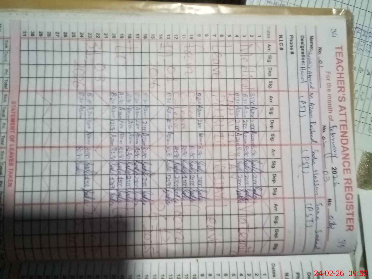 | Name: SH**** AH**** Designation: (School Headmaster's/Headmistress's) PST/PTC/JV Phone/Cell Number: 03**** |