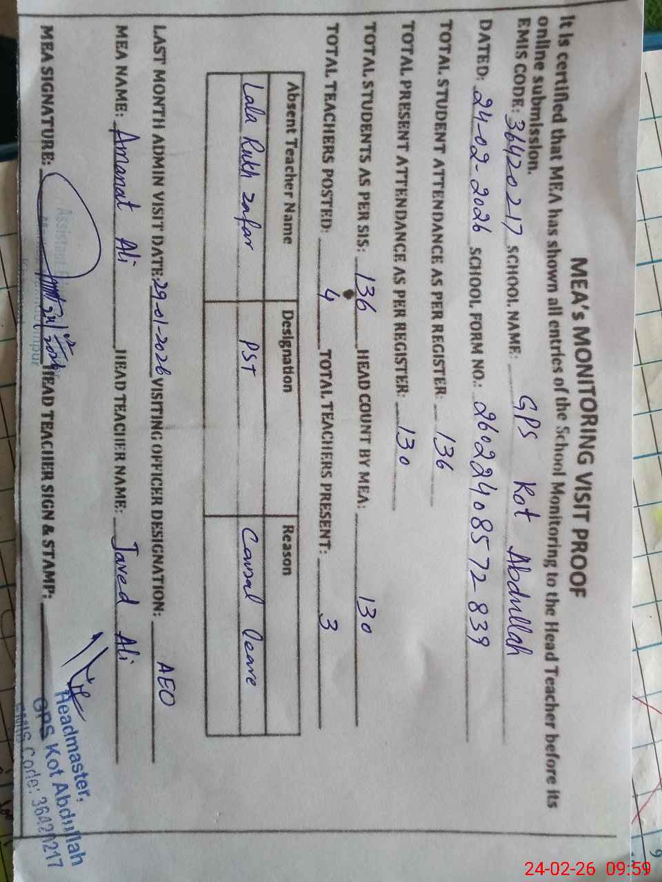| EMIS Code: 36420217 | Name of School: GPS KOT ABDULLAH, P/O MAKHDOOM PUR, KHANEWAL | |||