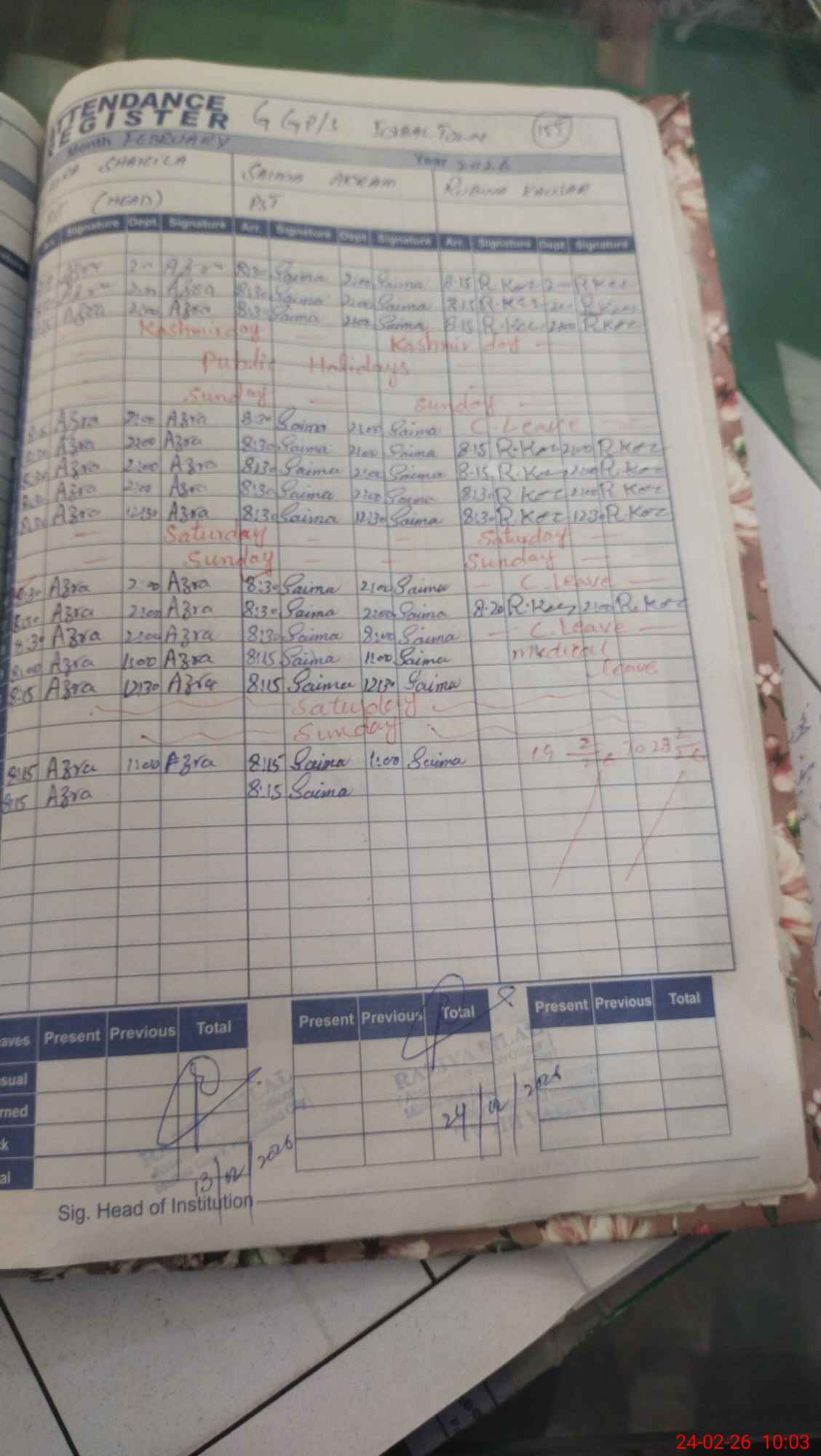 | Leave | Duty | Absent | Maternity | Medical | Ex- Pak |